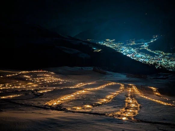 In the bitter cold of the Swiss dusk, ten residents of Davos climbed the slopes of the Rhaetian Alps on a mission to communicate with the world. Four hundred and fifty torches were lit to spell a message which glowed through the growing dark.